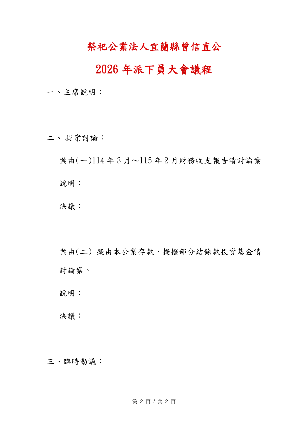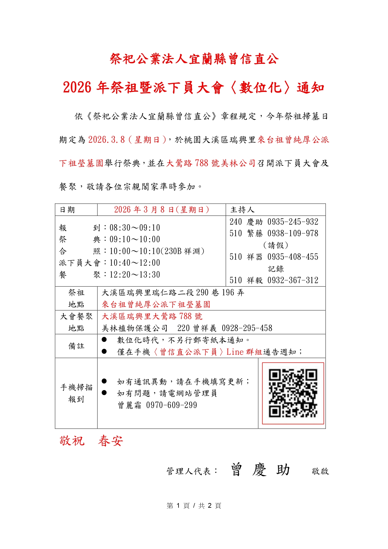 2026-02-23 通知3月8日曾氏家族祭祖掃墓暨派下員大會,派下員及家屬可填寫線上報到資料 祭祀公業法人宜蘭縣曾信直公 2026年祭祖暨派下員大會通知 於2026.03.08 (日)桃園市大溪區瑞興里 來台祖曾純厚公派下員祖瑩墓園舉行祭典,並召開派下員大會。 請宗親及家屬點擊填寫 -- 線上報到資料 -- (2026年已結束) 依組織章程第 7 條 (派下權終止)規定:經主管機關公告確定之派下員,若連續三年未共同承擔祭祀,經催告仍不參與祭祀者,得終止其派下權,並呈報主管機關核定。 ✽ 如派下員資料變更異動,請點我【填寫相關資料】 回上一頁